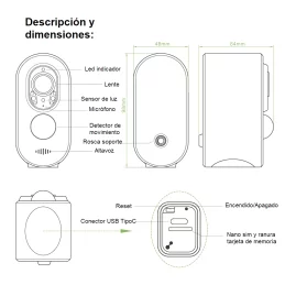 | Dimensiones | Tamaño cámara : 11 cm x 5cm x 5,5 cm , placa solar opcional | |